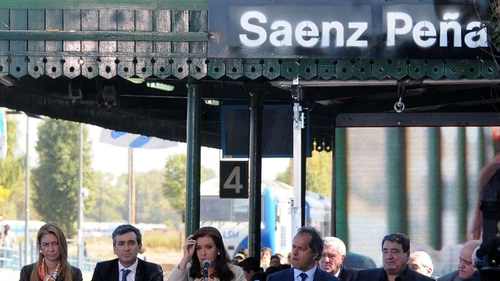 Al encabezar el acto de presentación del nuevo material rodante del ferrocarril San Martín, en la estación de trenes Sáenz Peña, en el partido de Tres de Febrero, Cristina recordó que hoy "la inversión en equipamiento es de 325 millones de dólares en todas las locomotoras nuevas y trenes nuevos para Rosario y Mar del Plata con vías nuevas".