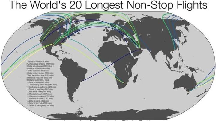 Un científico de Estados Unidos, Seth Kadish, decidió diseñar un mapa para mostrar la distancia de los vuelos sin escalas más largos del mundo. De esta manera, elaboró el dibujo que te mostramos a continuación, marcando en distintos colores los vuelos según las millas que los diferencian.