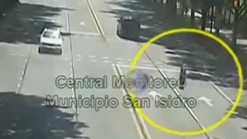 La rueda avanzó a gran velocidad por la cinta asfáltica, sobrepasó al micro, giró hacia la vereda, rebotó contra un árbol y golpeó violentamente a la mujer que caminaba bordeando el hipódromo de San Isidro. Todo quedó registrado por las cámaras de seguridad del Municipio.
