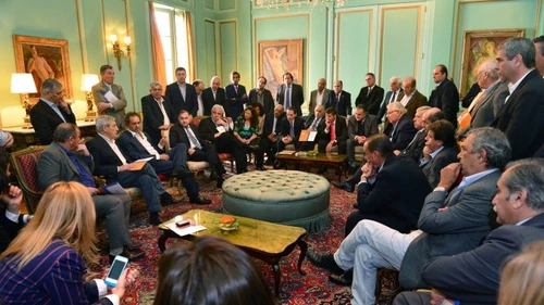 El gobernador de la provincia de Buenos Aires y precandidato presidencial del Frente para la Victoria, Daniel Scioli, se reunió este miércoles con más de 50 jefes comunales con quienes acordó el financiamiento de obras de infraestructura social en el marco de la Ley de Acceso Justo al Hábitat.