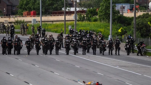 La muerte de George Floyd, un hombre negro, a causa de una brutal acción de un policía blanco de Minneapolis, ha encendido por quinto día consecutivo la mecha del resentimiento racial en el país. En la imagen, un grupo de policías antidisturbios pasa delante de un coche ardiendo en Minneapolis.