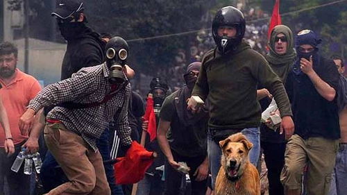 El protagonista es un perro de color te con leche, sin raza aparente, que aparece en varias fotos de las manifestaciones en Atenas.