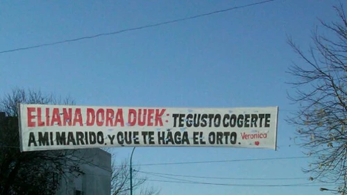 Colgó un pasacalles para escrachar a la amante de su marido y estalló en Twitter