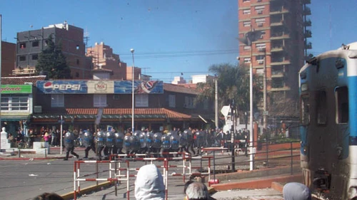 Un empleado de TBA intentó correr las maderas con el pie y lo apedrearon junto con todo el coche, esto se dio en simultáneo con la llegada de la Policía Federal quien avanzo sobre los manifestantes lanzando gases lacrimógenos y balas de goma.