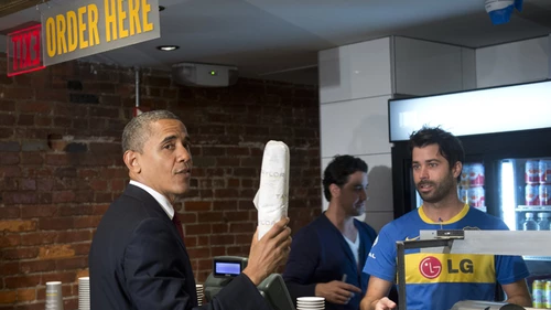 Una actividad oficial en la agenda de Barack Obama derivó en un hecho insólito. Durante su visita al restaurante “Taylor Gourmet”, ubicado en Washington D.C., fue atendido por David Mazza, uno de los dueños y fundadores de la empresa, mientras éste lucía una camiseta de Boca Juniors.