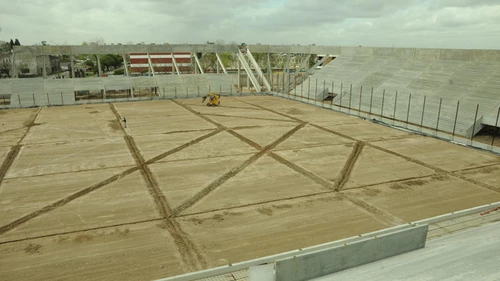 Además, ya se construyó la estructura de hormigón y se colocaron los caños que sostendrán el alambrado del estadio. Actualmente, se continúa con el montaje de los escalones que restan y se trabaja en los desagües pluviales del campo de juego.