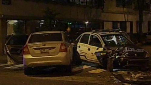 A la 1.30, en el cruce de Bogotá y Caracas, uno de los vehículos policiales chocó contra el Ford Focus y, a su vez, ambos colisionaron contra dos automóviles Volkswagen Gol que estaban estacionados.
