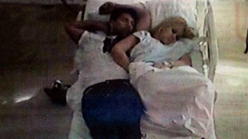 La rubia permaneció en la clínica hasta el domingo cuando fue dada de alta. Pero no se fue sin que antes algún fotógrafo indiscreto se haya colgado del techo para tomarle una foto junto a su "corazón mentiroso", durmiendo en la misma camilla que ocupa la pequeña cantante.