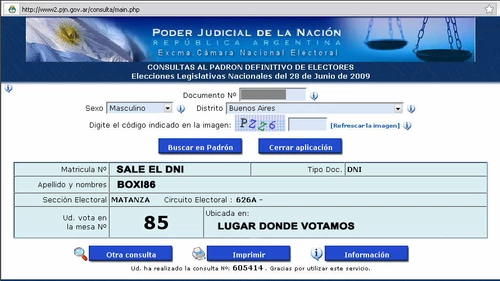La consulta puede realizarse telefónicamente al o por Internet en el sitio. En la Capital Federal, los interesados también podrán acceder a la información personalmente en la sede de la Cámara Nacional Electoral, en Leandro N. Alem 232, de 7.30 a 15.30; mientras que en el resto de los distritos podrán hacerlo dirigiéndose a la Secretaría Electoral correspondiente a su domicilio.