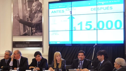 La presidenta Cristina Fernández de Kirchner anunció este martes el aumento del piso del mínimo no imponible a 15 mil pesos brutos a partir del 1 de setiembre, al abrir el segundo encuentro de Diálogo Político en Casa de Gobierno ante representantes gremiales y sindicales.