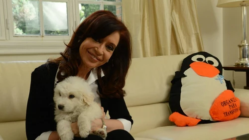 Durante su alocución, Cristina hace referencia al almohadón y al perro que sostiene en sus brazos - que llamó Simón -, un regalo del hermano del ex presidente venezolano, Hugo Chávez. "Fueron momentos difíciles, no lo voy a negar", admite sobre su operación.