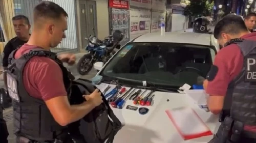 En presencia de testigos, el auto fue requisado y los oficiales encontraron una mochila y en su interior una pistola automática calibre 22 con un cargador con 7 cartuchos de bala, una pistola calibre 45 con un cargador con 9 cartuchos, 8 destornilladores, varios precintos de plástico, dos pinzas, esposas de metal con un juego de llaves, un par de guantes de goma, tres barbijos y prendas de vestir.