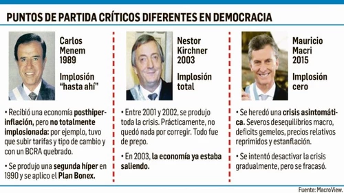 De modo que, según la visión de los gurúes de la City, el punto de partida de la próxima administración será parecido al de Menem 1989. Al respecto, MacroView caracteriza este escenario como el de una economía implosionada a medias, pero no totalmente corregida y mucho menos saliendo. "El contexto del 10-D no es el de Néstor K 2003-07, ni tampoco el de Cristina 2007-11. Tiene más parecido con Cristina 2012-15, con alguna pincelada de Cristina I". Sólo resta esperar si habrá idus entre octubre y diciembre.