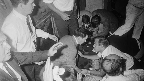 El 5 de junio de 1968, Robert F. Kennedy ganó las primarias y se convirtió en el candidato de los demócratas. Por la noche, tras el recuento que le dio la candidatura, dedicó unas palabras a sus seguidores en el hotel Ambassador de Los Ángeles (en la imagen). Poco después, fue tiroteado.