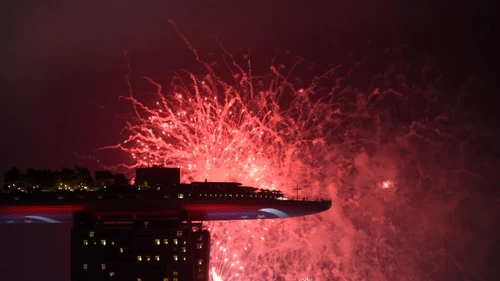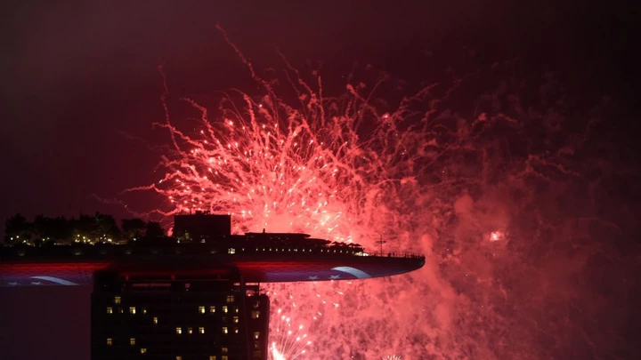 Los fuegos artificiales iluminan el horizonte durante el 53 ° desfile del Día Nacional en Singapur.