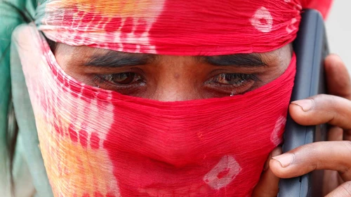 La esposa de un trabajador migrante llora mientras habla con un pariente por teléfono que fue detenido en las carreteras para volver a su ciudad natal en UttarPradesh. (Adnan Abidi)