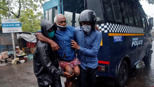 Los oficiales de policía evacuan a un residente discapacitado de un barrio pobre antes de que el ciclón Amphan golpee el área de Calcuta, India. (Rupak de Chowdhuri)