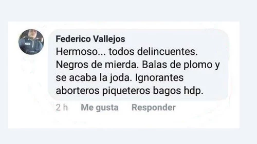 El pasado 24 de octubre, el policía Federico Edgardo Vallejo comentó un posteo de Facebook que hizo el dirigente Martín Ogando sobre su espacio político. El policía escribió: "Hermoso... todos delincuentes. Negros de mierda. Balas de plomo y se acaba la joda. Ignorantes aborteros piqueteros bagos (sic) hdp".