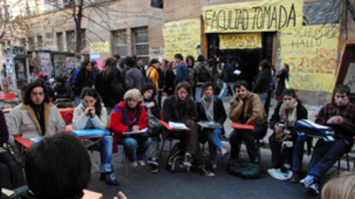 Desde media mañana y hasta el mediodía del lunes, alumnos universitarios, con al apoyo de docentes, ubicaron pizarrones y pupitres sobre la calle y organizaron clases públicas, en repudio al asesinato de Mariano Ferreyra.