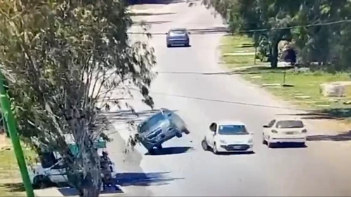 Esto provocó que la Chevrolet lo impacte con fuerza por detrás y se desestabilice. La camioneta quedó suspendida del costado y casi vuelca, sin embargo, cayó por su propio peso a la posición natural.