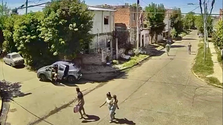 En las imágenes también se observa el momento en que una pareja que caminaba con una niña en brazos pasa por el lugar mientras ocurría el asalto y se aleja rápidamente de la escena para ponerse a resguardo.