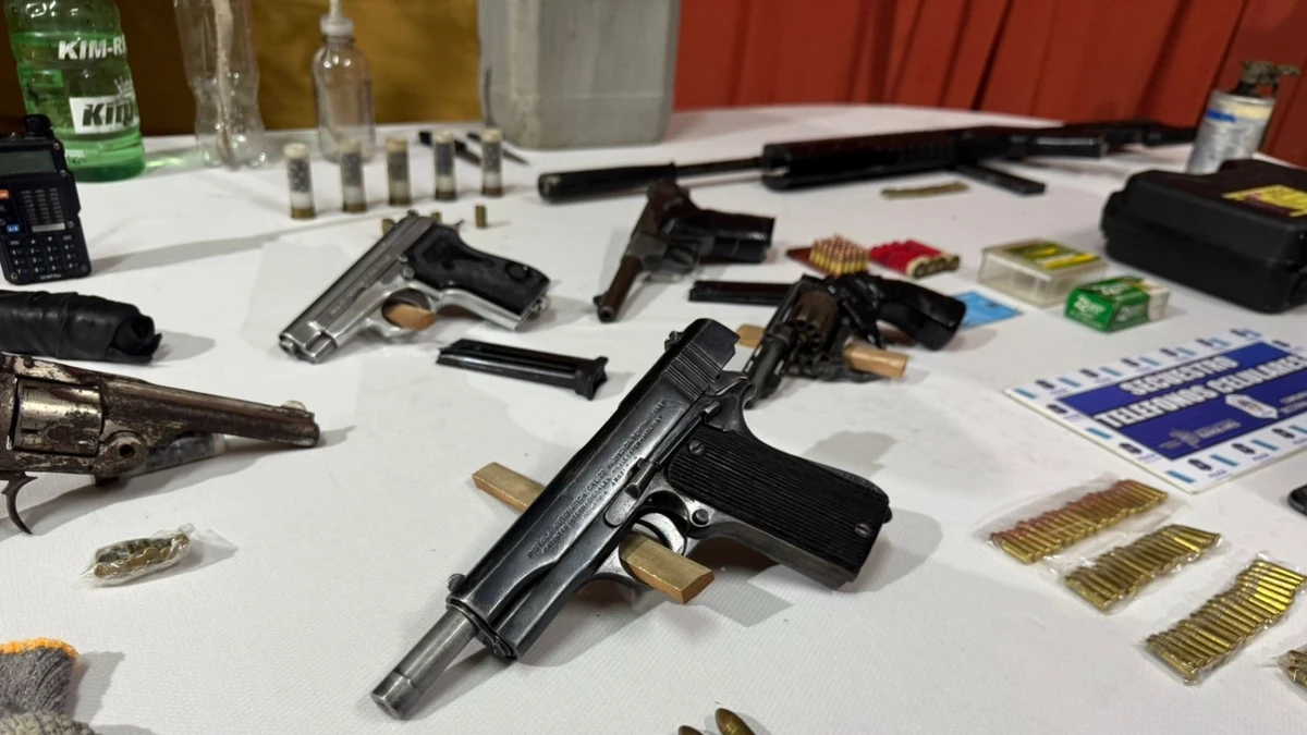 Los efectivos encontraron tres pistolas, dos revólveres y una carabina además de municiones de otro rifle y cartuchos de escopeta, armas que están siendo aún buscadas. A su vez, hallaron tres bombas molotov, una granada de gas lacrimógeno y siete cuchillos.