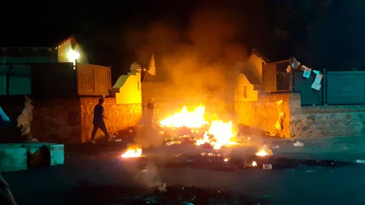 Allí se llevaron pancartas y se instalaron los manifestantes quienes comenzaron por encender neumáticos y con el correr de las horas optaron por quemar uno de los portones de acceso y arrojar basura al interior de la propiedad.