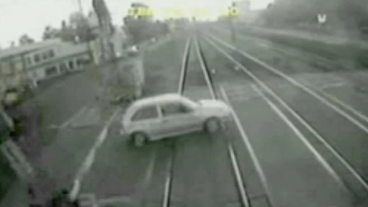 Una formación del ferrocarril Sarmiento embistió esta mañana a un VW Gol en la localidad de Ramos Mejía, en momentos en que el auto intentaba pasar con las barreras bajas.