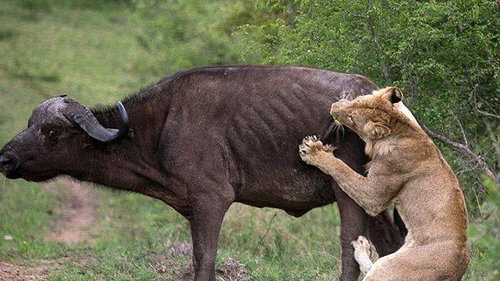 Es entonces que aparecen otros búfalos en auxilio del compañero vencido. Uno de ellos arremete con su cornamenta al león haciendo que este vuele por los aires sin control antes de caer al suelo. Esto no dejó conforme al enfurecido animal que vuelve atacar al felino levantándolo con violencia sobre sus cuernos.