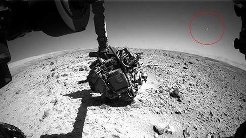 En una imagen capturada este mes de enero por el Curiosity, en el cielo marciano aparece un objeto que atrajo la atención de los que están convencidos de que hay vida en otros planetas. El objeto tiene forma cónica y desprende algo que parece una estela de vapor.