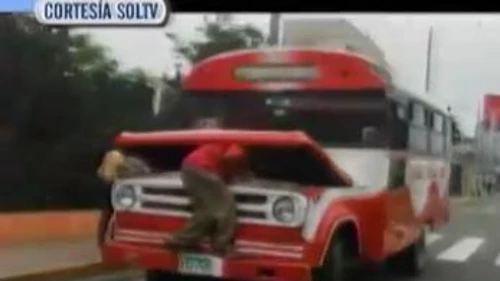 Este insólito hecho ocurrió en la ciudad peruana de Trujillo. El sujeto, que llevaba el uniforme de la empresa de transportes, tenía medio cuerpo dentro del capó del vehículo.