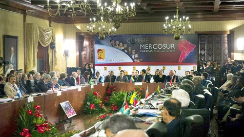 Al asumir la presidencia pro témpore del Mecosur en Caracas, la presidenta Cristina Fernández de Kirchner se refirió al conflicto con los fondos buitre y señaló que "el juez (del distrito sur de Nueva York, Thomas Griesa) no actúa acorde a derecho".