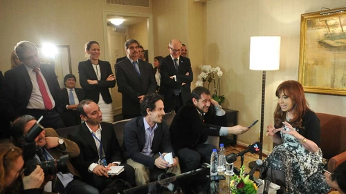 En diálogo con los periodistas argentinos que cubrieron su visita a las Naciones Unidas, en el piso 54 del Hotel Mandarin de Nueva York, la Presidenta reiteró conceptos vertidos durante su discurso en la Asamblea General de la ONU, y destacó la aprobación por parte del organismo internacional de la resolución que apunta a la creación de un marco regulatorio y jurídico para las reestructuraciones de deuda soberanas. En ese sentido ratificó su deseo de "tener sancionada esta norma para la próxima Asamblea (General) de 2015".
