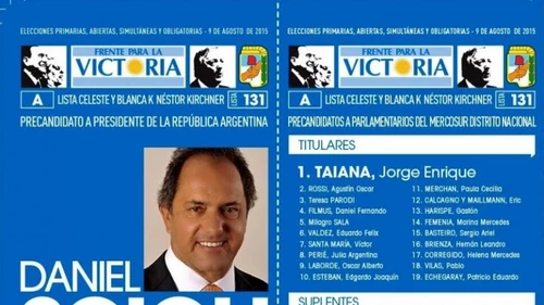 La fórmula presidencial del Frente para la Victoria, integrada por Daniel Scioli y Carlos Zannini oficializó este martes el modelo de boleta con la que competirá en las próximas elecciones Primarias Abiertas Simultáneas y Obligatorias (PASO) del 9 de agosto.