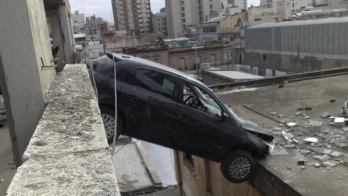 Un automóvil rompió la pared del tercer piso de una cochera del centro de la ciudad de Córdoba y quedó atascado entre las paredes de dos edificios, por lo que bomberos intentan aún buscar la manera de bajar el vehículo sin daños mayores.
