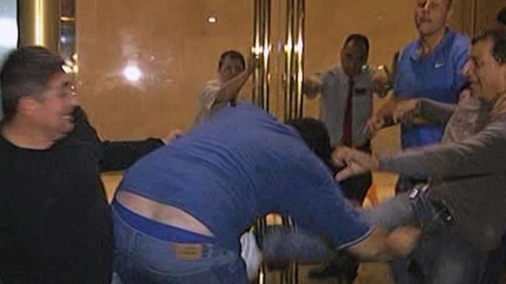 Finalmente, bajo el ojo de la cámara el hombre, que se tomaba el hombro con dolor, pudo subirse a un radio taxi y salir del lugar.
