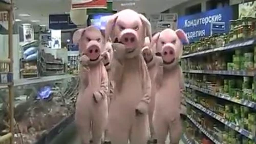 Un grupo de activistas rusos se presentó en un hipermercado del distrito capitalino de Sokólniki y marchó en contra de los dueños del comercio, a quienes acusan de vender productos vencidos. Lo curioso es que, para llamar la atención, lo hicieron disfrazados de cerdos.