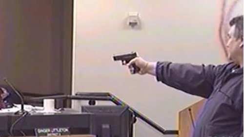 Después del forcejeo del hombre armado con una mujer de la junta escolar se oyeron al parecer un par de tiros en el interior de la sala de juntas, momento en que, Jones, que debió entrar por una puerta lateral, disparó contra el individuo.