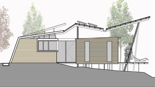 La cubierta de esta vivienda cumplen una función de recolectar el agua de lluvia para el llenado de la pileta y el riego de la huerta, de esta forma se produce un ahorro de agua potable.