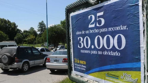 El afiche, con sus enormes letras y números blancos contrastados con azul, reza: “25 años de un hecho para recordar, 30.000 razones para no olvidarlo”.