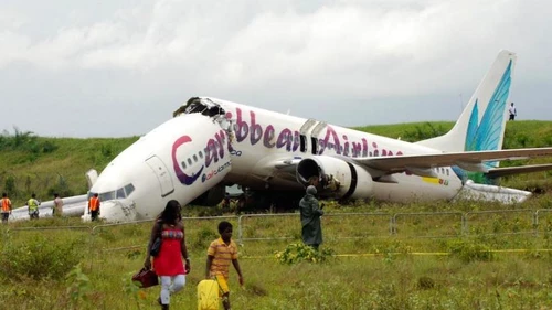 Un Boeing 737-800 de Caribbean Airlines con 163 pasajeros no logró frenar a tiempo y terminó fuera de pista y partido en dos; a algunos pasajeros los auxiliaron taxis que luego les cobraron el traslado al aeropuerto