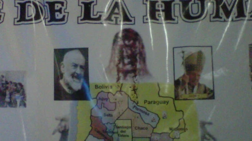 Otra imagen increíble e impactante en el Conurbano. Más precisamente en Quilmes Oeste. Es que desde el domingo comenzó a brotar un líquido rojo de un cartel que tiene la imagen de la Virgen de la Humanidad. Un afiche que los denominados "servidores" llevan a distintos puntos del país. "El fin de semana pasado estuvo en Corrientes, antes había estado en la Patagonia. Durante la madrugada del domingo, la imagen comenzó a llorar sangre", relató a 24CON Claudia Buchet, la dueña de la casa ubicada en Martín García 3243. Es, según reza el contestador automático, el hogar de la Virgen. "Para dejar su oración espere la señal".