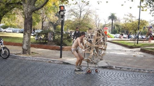 “Hago este tipo de intervenciones urbanas en las calles de todo el mundo y en esta última etapa ya lo hice en Colombia, Perú, Ecuador, Chile y ahora en Argentina. El carro que utilicé hoy representa un mundo propio que cada uno va arrastrando, viene de la mitología griega. Pero también hago performance, dibujo, títeres, soy lo que aquí llaman un ‘artista urbano’, aunque suele pasar que a la Policía no le guste el arte. Sucede con ellos en casi todo el mundo”, señaló el artista del día. Por lo menos para los vecinos de La Plata.