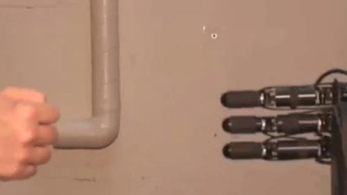 La mano robótica está diseñada con tres dedos. Si los dobla, es la piedra; si los extiende, es el papel; y si apunta sólo dos de sus dedos, es la tijera.