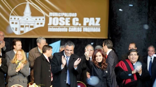 La presidenta Cristina Fernández de Kirchner, quien ayer presentó un billete con la imagen de Eva, preside un acto en el Mercado Concentrador de José C. Paz, en el que esta acompañada por el intendente local, Carlos Urquiaga, y también por Mario Ishi, por quien fue su antecesor.
