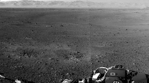 La NASA difundió también este miércoles la primera foto panorámica de los alrededores del robot espacial. En la imagen, en blanco y negro, aún de muy baja resolución, se reconocen colinas en el horizonte.
