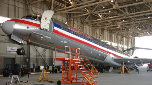 Un avión de la aerolínea norteamericana American Airlines, aparentemente un MD 80, sufrió un serio problema. Al apoyarlo sobre un crique en la zona de la cola, el metal del fuselaje cedió por la presión en una zona corroída y “se comió” el apoyo. El avión termino con la nariz apuntando al cielo y los mecánicos sacándole fotos. Es difícil que vuelva a volar aunque los daños son reparables.