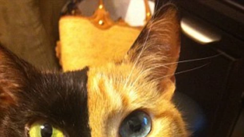 Se trata de un felino de raza europea que tiene el rostro divido en dos: uno de color amarronado y el ojo azul y el otro de color negro y el ojo amarillo.