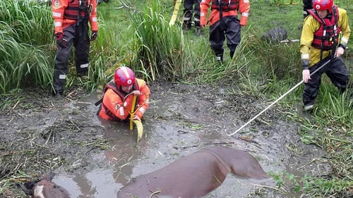 Un caballo atrapado en un estanque fangoso fue rescatado de una muerte segura después que los bomberos pasaron más de tres horas tirando de él hacia tierra firme.