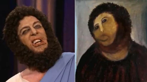 Durante su monólogo de apertura, el pelirrojo presentó el caso como algo "bastante asombroso que viene de España", para después decir que se trataba del "peor trabajo de restauración jamás visto".
